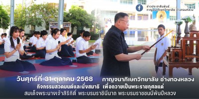 11 ชั่วโมง ที่ผ่านมาวันศุกร์ที่ 31 ตุลาคม 2568 ดร.ฉัตรชัย พันธ์นุรัตน์ รองผู้อำนวยการ รักษาราชการแทนผู้อำนวยการ กาญจนาภิเษกวิทยาลัย ช่างทองหลวง มอบหมายให้ นายถนอมศักดิ์ นะโรภาส ผู้ทรงคุณวุฒิ เป็นประธานใน กิจกรรมสวดมนต์และนั่งสมาธิ เพื่อถวายเป็นพระราชกุศลแด่ สมเด็จพระนางเจ้าสิริกิติ์ พระบรมราชินีนาถ พระบรมราชชนนีพันปีหลวง กิจกรรมดังกล่าวจัดขึ้นเพื่อให้คณะผู้บริหาร ครู บุคลากรทางการศึกษา และนักเรียนนักศึกษา ได้ร่วมแสดงความจงรักภักดี พร้อมน้อมสำนึกในพระมหากรุณาธิคุณอันหาที่สุดมิได้ ผ่านการปฏิบัติกิจกรรมทางพระพุทธศาสนา อันเป็นการส่งเสริมคุณธรรม ความสงบทางจิตใจ และเสริมสร้างสมาธิในการดำเนินชีวิตและการเรียนรู้ 📍 ณ กาญจนาภิเษกวิทยาลัย ช่างทองหลวง