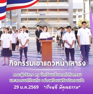 📅 วันจันทร์ที่ 26 มกราคม 2569 ดร.ฉัตรชัย พันธ์นุรัตน์ รองผู้อำนวยการ รักษาราชการในตำแหน่งผู้อำนวยการกาญจนาภิเษกวิทยาลัย ช่างทองหลวง มอบหมายให้ นางสำอางค์ ปินตาคำ รองผู้อำนวยการฯ คณะผู้บริหาร ครูและบุคลากรทางการศึกษา ร่วมต้อนรับนักเรียน นักศึกษา พร้อมกล่าวให้โอวาทและความรู้แก่นักเรียน นักศึกษา เพื่อเสริมสร้างกำลังใจในการเรียน และสร้างแรงบันดาลใจในการพัฒนาตนเอง และแจ้งข่าวสารประชาสัมพันธ์กิจกรรมต่างๆจากงานกิจกรรมนักเรียน นักศึกษา รวมถึงให้นักเรียน นักศึกษา โฮมรูมพบครูที่ปรึกษาหลังกิจกรรมเข้าแถวหน้าเสาธง เพื่อรับฟังข้อเสนอแนะ ติดตามผลการเรียน และพูดคุยถึงแนวทางการพัฒนาตนเองอย่างต่อเนื่อง 📌ณ ลานโดม อเนกประสงค์ กาญจนาภิเษกวิทยาลัย ช่างทองหลวง