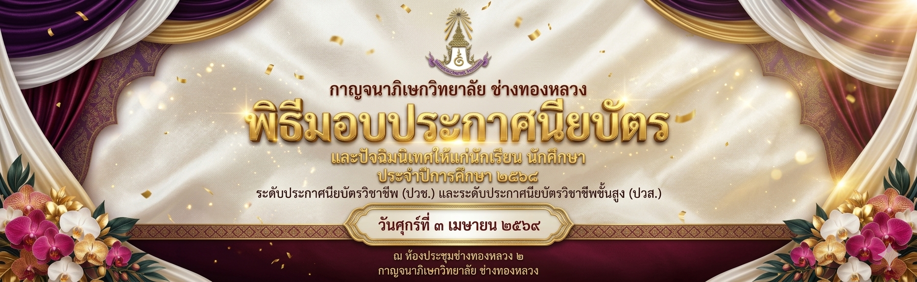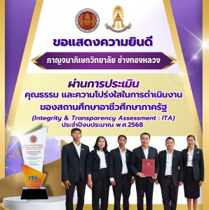 วันที่ 25 มีนาคม 2569 นายศุภชัย นนท์ธีระวิชยา ผู้อำนวยการกาญจนาภิเษกวิทยาลัย ช่างทองหลวง พร้อมด้วยคณะผู้บริหาร เข้าร่วมพิธีเชิดชูเกียรติสถานศึกษาอาชีวศึกษาที่ผ่านการประเมินคุณธรรมและความโปร่งใสในการดำเนินงาน (Integrity & Transparency Assessment : ITA) ประจำปีงบประมาณ พ.ศ. 2568 โดยมีนายยศพล เวณุโกเศศ เลขาธิการคณะกรรมการการอาชีวศึกษา เป็นประธานในพิธี และมอบโล่ประกาศเกียรติคุณพร้อมเกียรติบัตรแก่สถานศึกษาที่ผ่านเกณฑ์