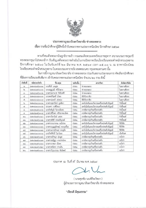 ประกาศกาญจนาภิเษกวิทยาลัย ช่างทองหลวง เรื่อง ประกาศรายชื่อนักศึกษาผู้มีสิทธิ์เข้ารับพระราชทานประกาศนียบัตร ปีการศึกษา 2568