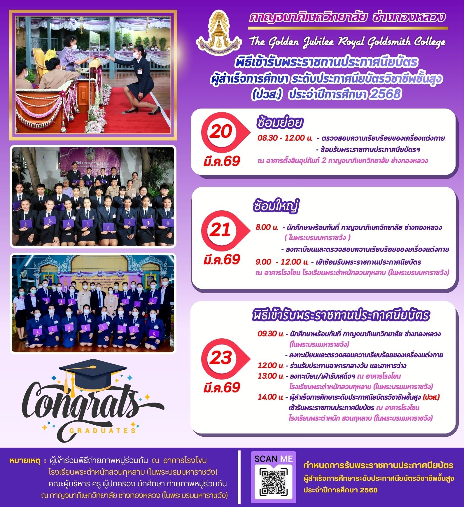 กาญจนาภิเษกวิทยาลัย ช่างทองหลวง ขอแจ้งกำหนดการเตรียมความพร้อมและพิธีเข้ารับพระราชทานประกาศนียบัตร ประจำปีการศึกษา 2568 ของผู้สำเร็จการศึกษา ระดับประกาศนียบัตรวิชาชีพชั้นสูง (ปวส.)