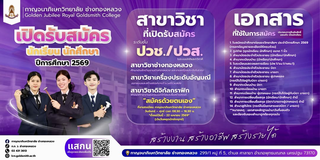 📢 โค้งสุดท้าย! เปิดรับสมัครนักเรียนนักศึกษาใหม่ การศึกษา 2569 รอบทั่วไป แล้ววันนี้ กาญจนาภิเษกวิทยาลัย ช่างทองหลวง✨